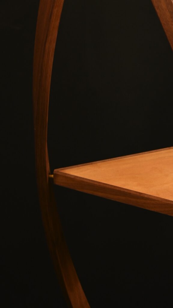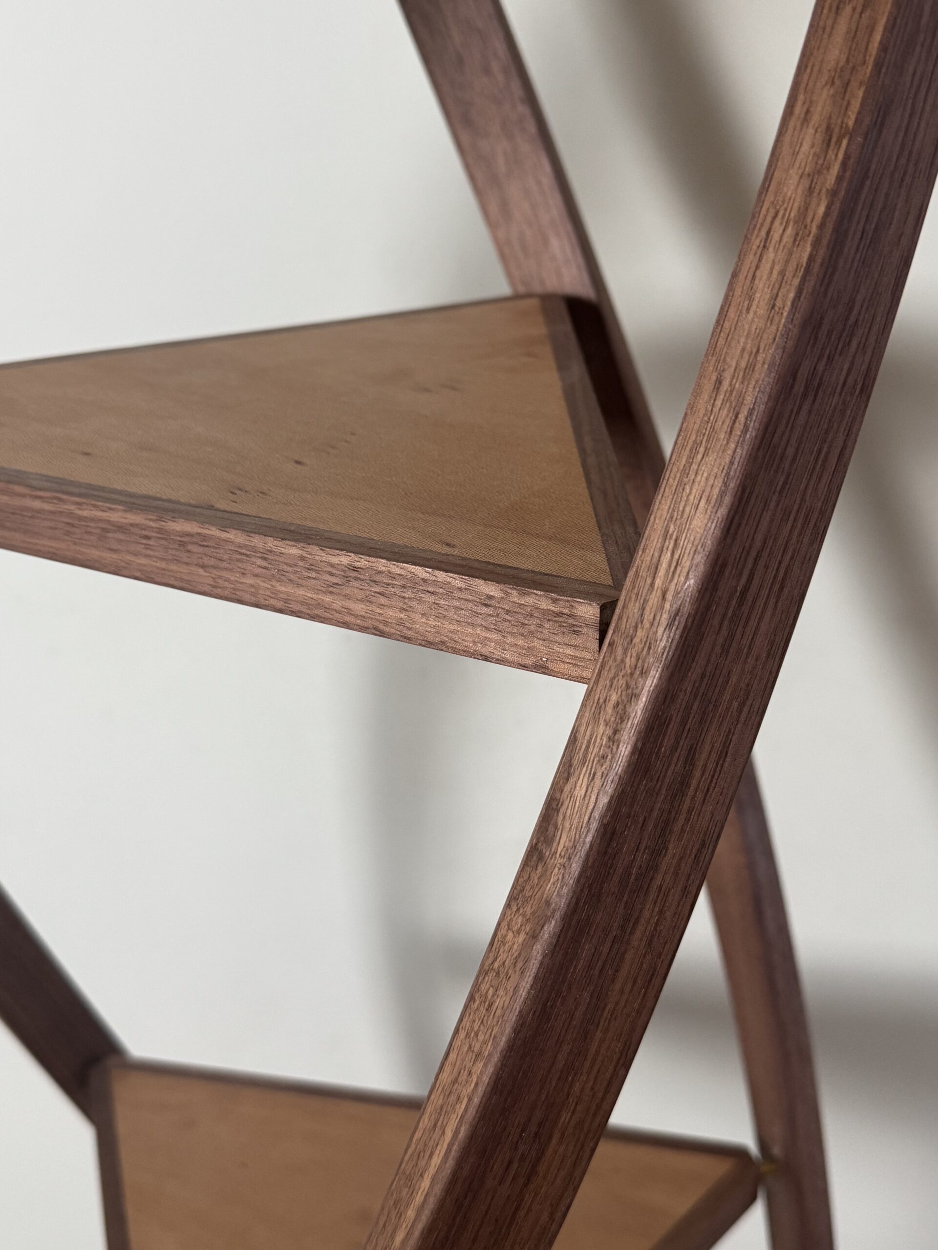 Another thing to consider was that if I just used the wood as a solid piece then you would end up seeing engrain and all sorts of weird effects on certain sides of each triangle. To counteract this anomaly I decided to unify each shelf by edging each side in long grain. This created a consistent grain wrap all the way around each triangle. Oh yeah – sigh – that introduced a problem of wood movement. I can’t wrap solid wood without the risk that wood expansion might open up a corner of the triangle. So to counteract that each shelf is actually a core of stable MDF, veneered in London Plane and then wrapped in long grain Walnut on the edges. Quite a lot of steps but the end result is triangular shelves that look consistent from any angle. I’ll spare you with the custom clamp I also needed to build to glue the edging on a triangle shaped object. Success.